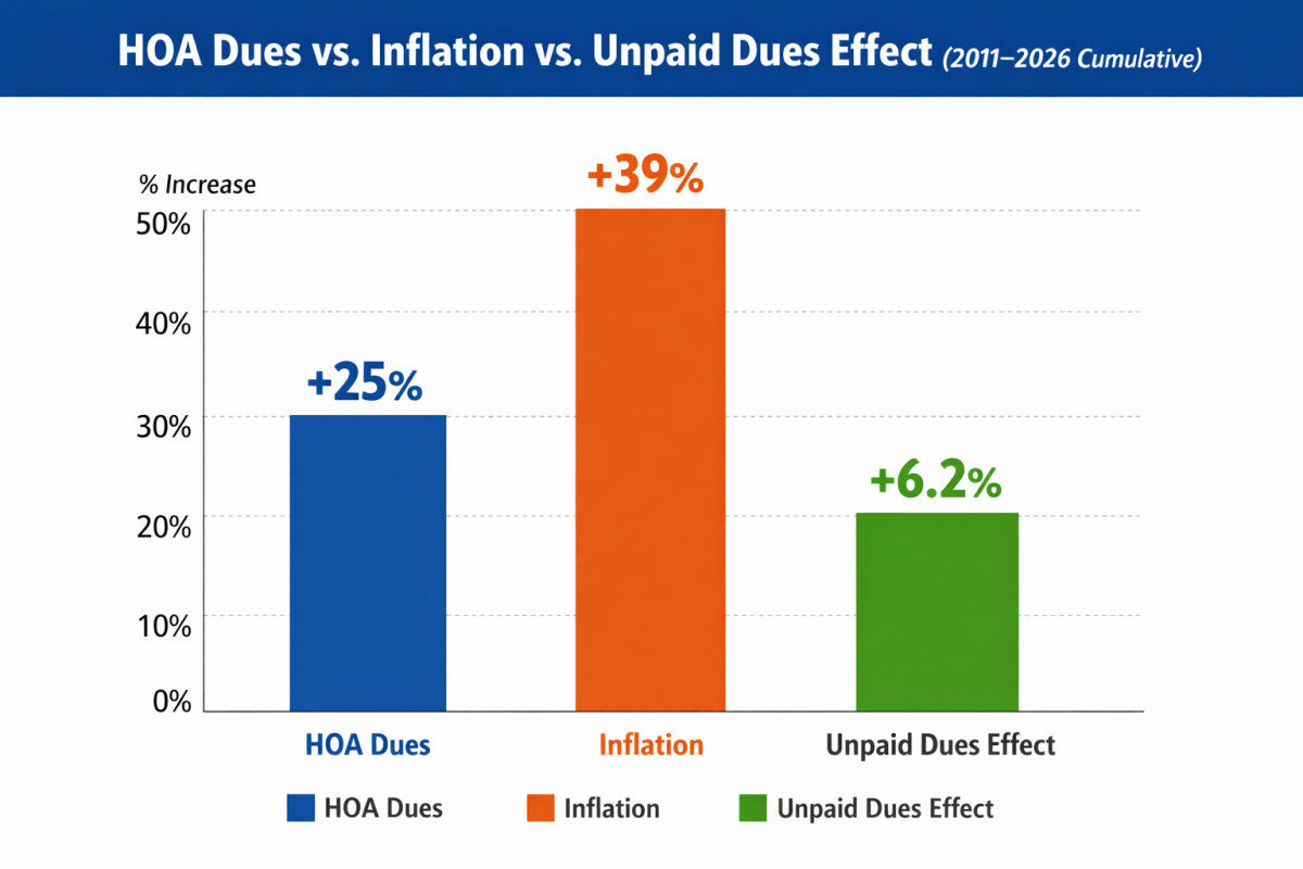 - Inflation: Naturally, costs tend to rise over time, even at average inflation rates. Developers often set initial HOA dues very low to attract new buyers, leaving the Board responsible for establishing a more realistic assessment to properly fund community operations. Even so, the 2026 annual assessment is only 25% higher than in 2011, while cumulative CPI inflation over the same period has increased by approximately 39%. (source)